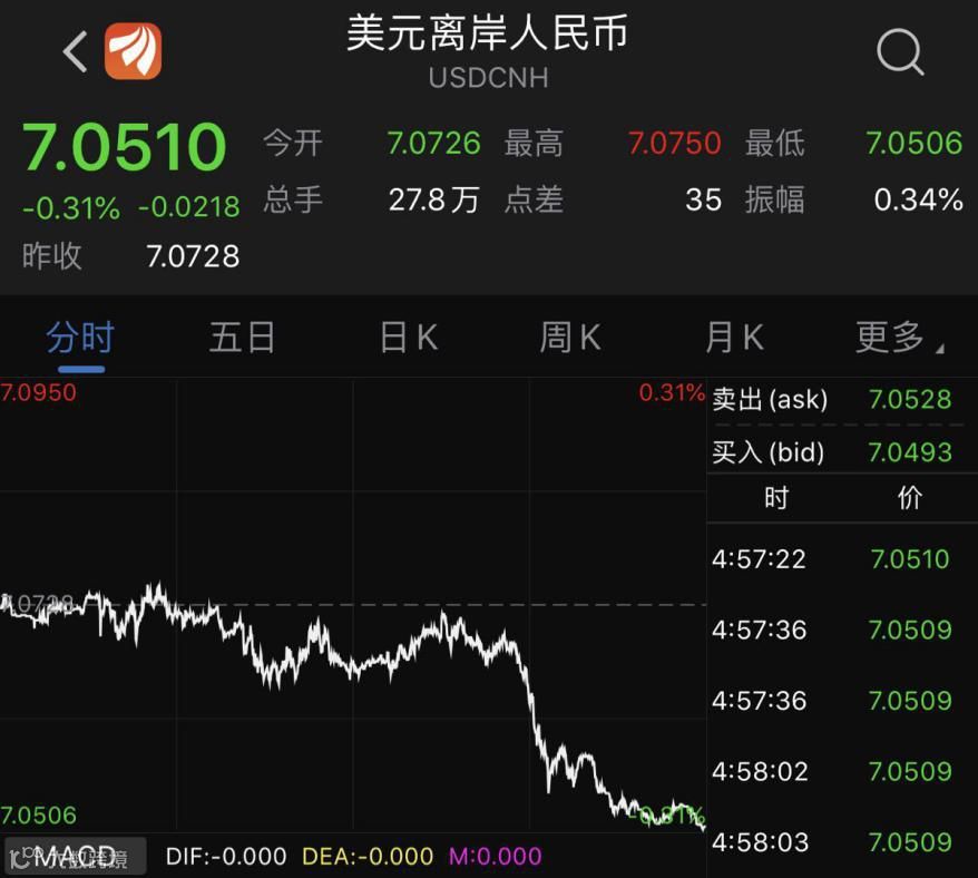 隔夜离岸人民币收盘报7.0510,单日上涨近230点。