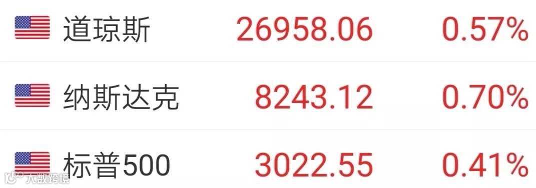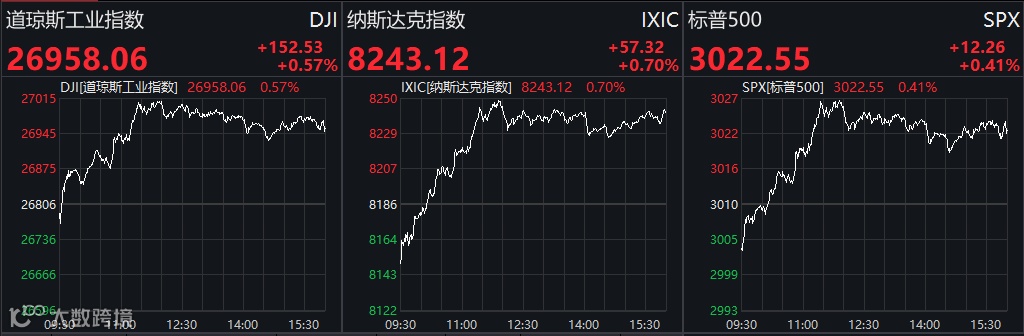 来自WIND的数据显示,周五道指涨0.57%,报26958.06点,标普500涨0.41%,报3022.55点,纳指涨0.7%,报8243.12点,三大股指均逼近历史最高收盘纪录。本周,道指涨0.7%,纳指涨1.9%,连涨四周;标普500涨1.22%,连涨三周。