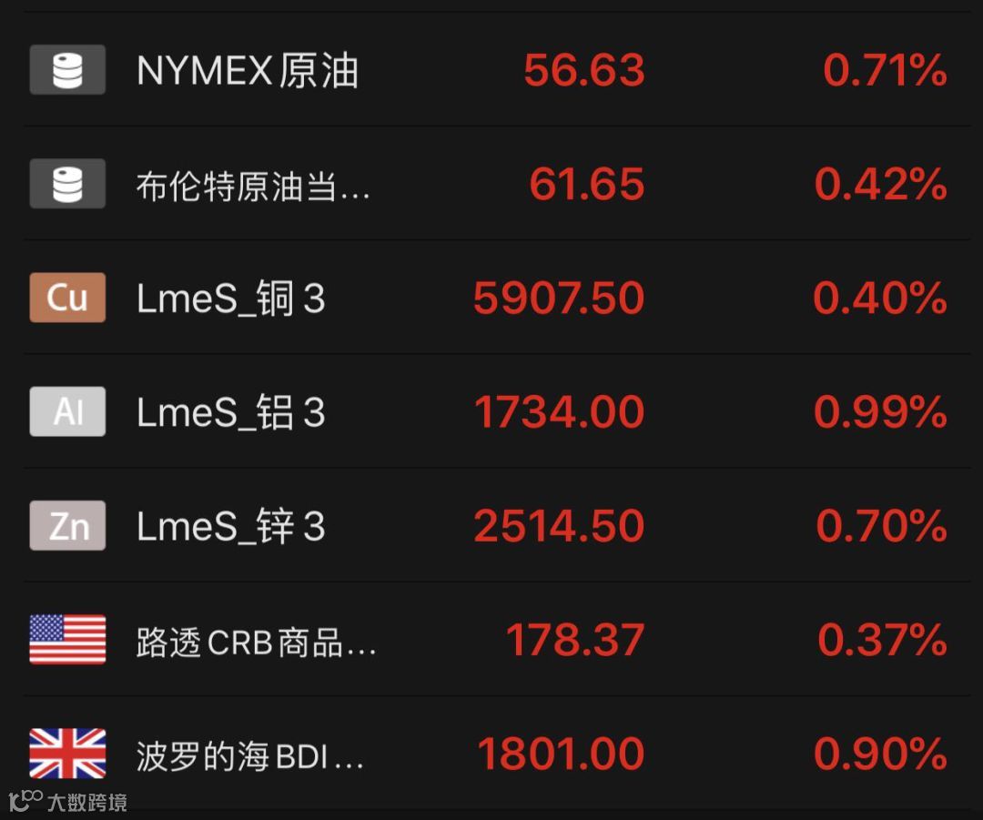 除了股市之外,外围商品市场亦表现不俗,主流商品期货全线上扬。显示,市场对未来经济的预期较为乐观。