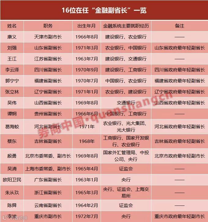 据券商中国记者统计,目前在任的“金融副省长”已有16名,多出自五大国有银行及金融监管机构,其中多位“金融副省长”还是当地最年轻的副省长。