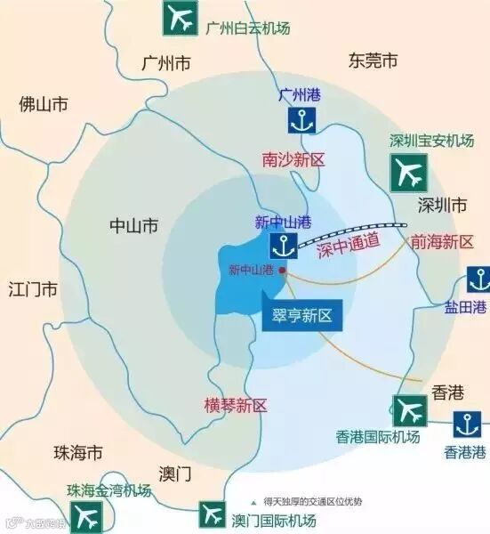 中山东岸成珠西交通枢纽 在建的深中通道、深茂铁路等重大基建工程,直将中山升级为珠三角西岸交通枢纽。翠亨新区作为深中通道在中山的登陆点,在交通上也加快提速。