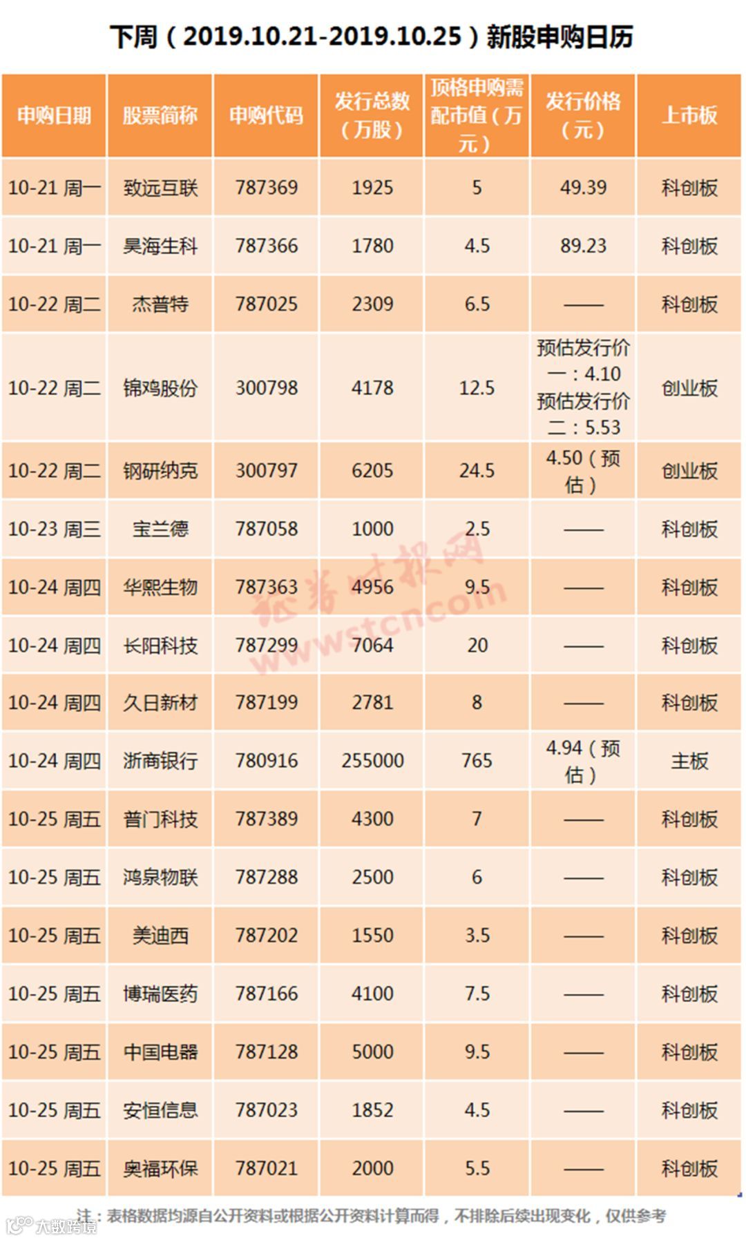根据目前公开的资料,本周(2019.10.21-2019.10.25)新股发行密集,初步计划将有多达17只新股申购,其中周一2只、周二3只、周三1只、周四4只,周五则多达7只,具体的新股申购日历如下: