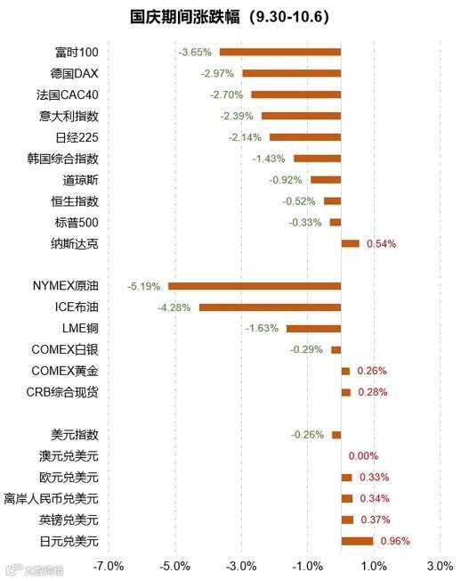 受美国经济数据不及预期影响,国庆假期全球股市全线下跌;但美股在近两个交易日连续上涨,收复部分跌幅,纳斯达克指数假期上涨0.54%。欧央行降息难止经济下行趋势,与此同时,脱欧进程反复影响市场风险偏好,欧洲股市假期领跌全球市场。