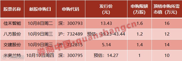 本周共有4只新股申购,分别是佳禾智能、八方股份、交建股份、米奥兰特,其中佳禾智能申购日期为周二(10月8日),米奥兰特申购日期为周四(10月10日),八方股份和交建股份申购日期均为周三(10月9日),申购详情如下: