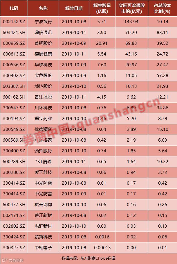 数据显示,本周(10月8日-10月11日)共有22家公司限售股陆续解禁,合计解禁量54.35亿股,按9月30日收盘价计算,解禁市值为401.17亿元,较上周487.41亿的解禁市值环比减少21.5%。