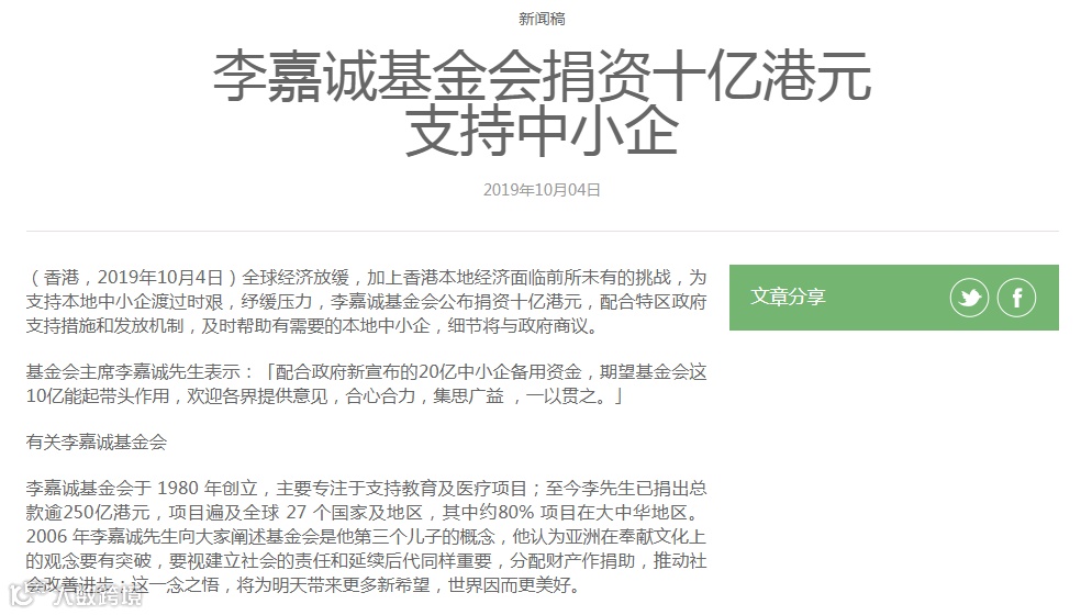 其实早在10月4日,李嘉诚基金会官网就已显示,因全球经济放缓,加上香港本地经济面临前所未有的挑战,为支持本地中小企渡过时艰,纾缓压力,李嘉诚基金会公布捐资十亿港元,配合特区政府支持措施和发放机制,及时帮助有需要的本地中小企,细节将与政府商议。