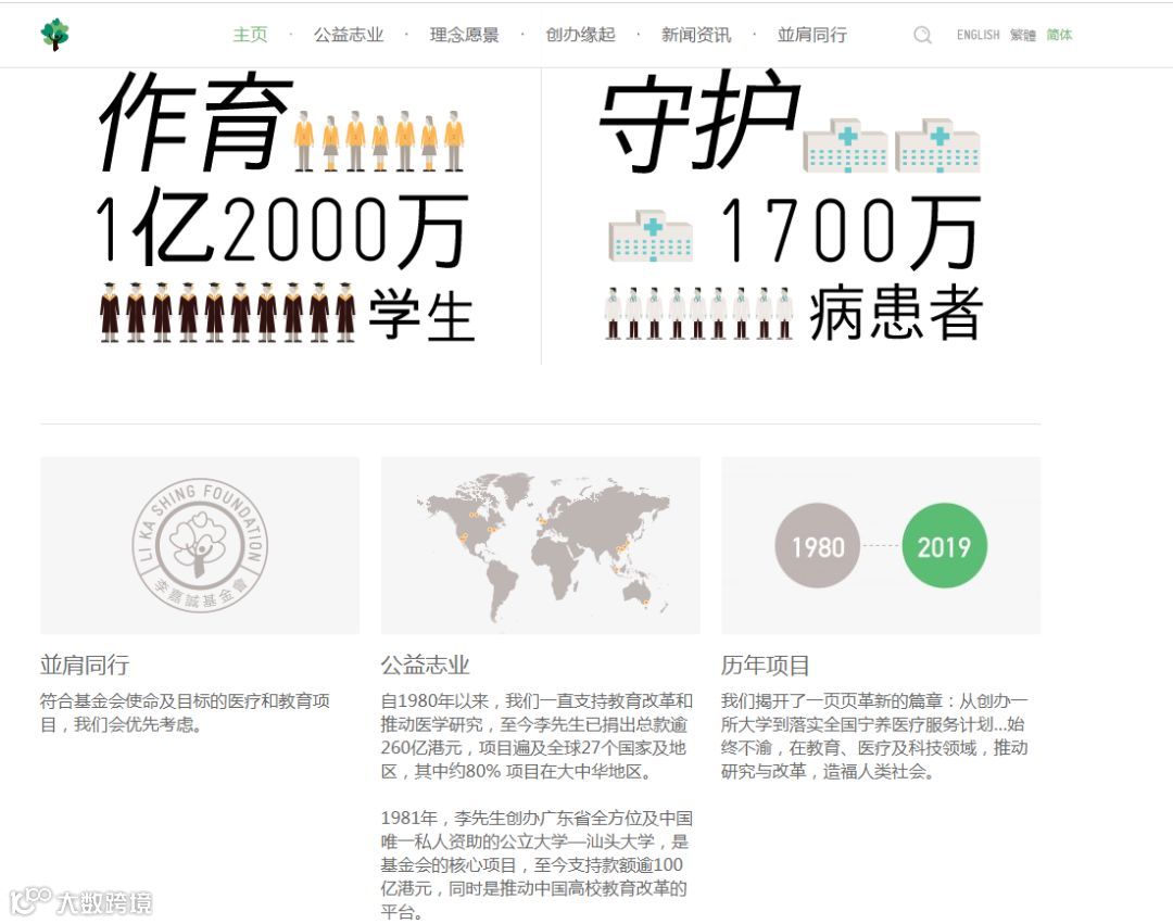 李嘉诚基金会于1980年创立,主要专注于支持教育及医疗项目。至今李嘉诚已捐出总款逾250亿港元,项目遍及全球27个国家及地区,其中约80%项目在大中华地区。