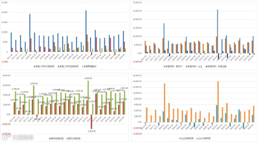 房地产开发贷处于下行趋势当中,但非金融/非房地产企业的贷款却开始扩张。9月企业部门新增贷款10113亿,同比、环比分别变动 3341亿元、3600 亿元。其中企业新增短期贷款2550亿,同比、环比分别变化1452、2905亿元。新增中长期贷款5637亿、同比、环比分别变动1837、1352亿元。票据融资1790亿元,同比基本稳定、环比回落636亿元。非银贷款减少659亿,同比多减56亿。企业部门新增贷款当月规模有所放量,导致当月新增信贷达到今年3月的高水平。