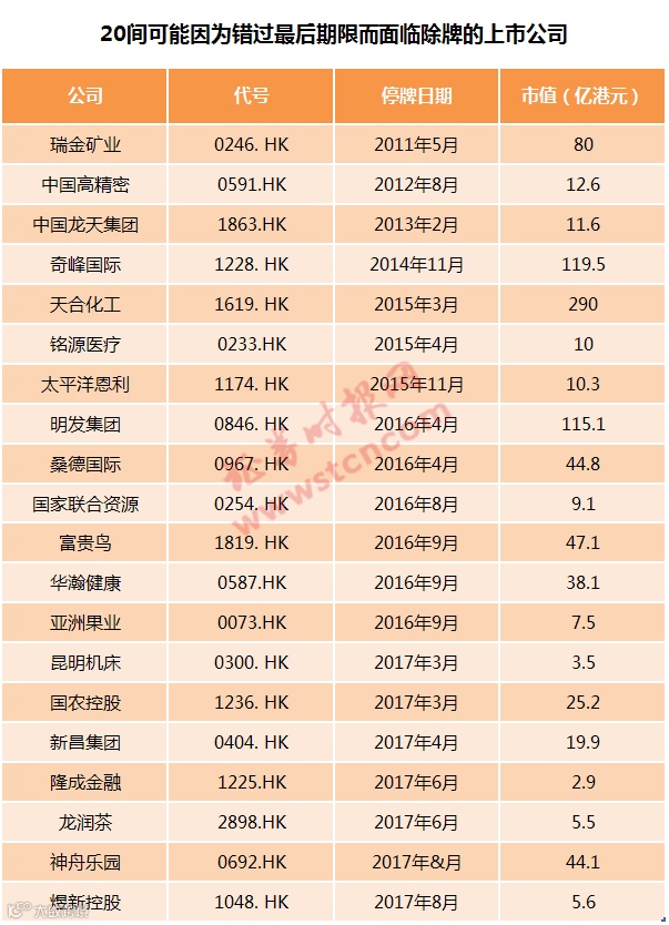 据记者统计,截至2019年8月1日前,尚有20家上市公司未能提出复牌请求,并说服香港证监会他们具备复牌资格,这些公司都将面临被除牌的结局。