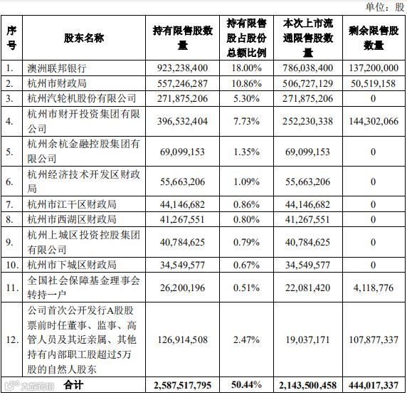 2016年10月27日,杭州银行在上海证券交易所挂牌上市;首次公开发行后,公司总股本为26.17亿股,其中有限售条件流通股23.56亿股,无限售条件流通股2.62亿股。该行实施2016年度和2017年度利润分配及资本公积转增股本方案后,总股本数量由26.17亿股增加为50.3亿股。