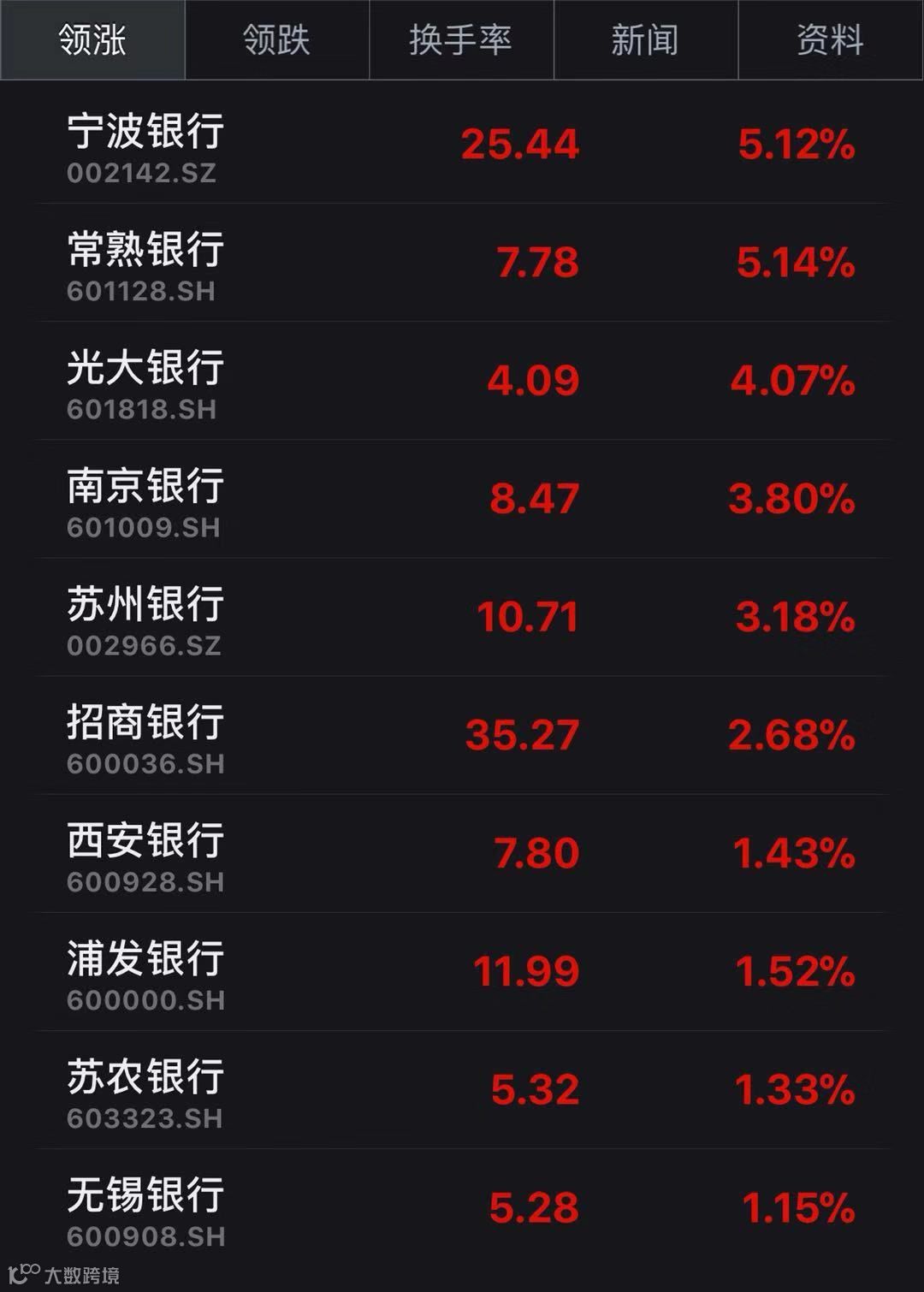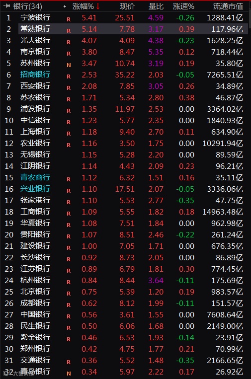 受此影响,今日银行股逆势大涨,宁波银行、常熟银行大涨逾5%,光大银行涨逾4%,南京银行、苏州银行涨逾3%,招商银行、西安银行涨逾2%。