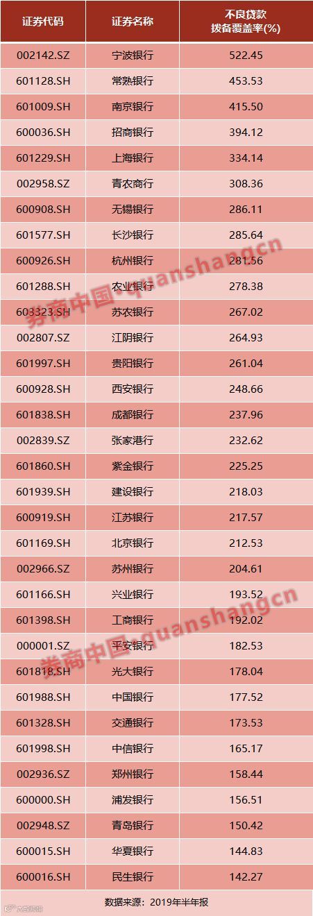 也就是说,如果银行拨备覆盖率超过300%,按《规则》就被视为存在隐藏利润的倾向,要对超额计提的拨备还原成银行未分配利润,以更为真实的反映银行的盈利情况。根据上市银行公布的2019年上半年业绩数据显示,拨备覆盖率超过300%的银行有近10家。