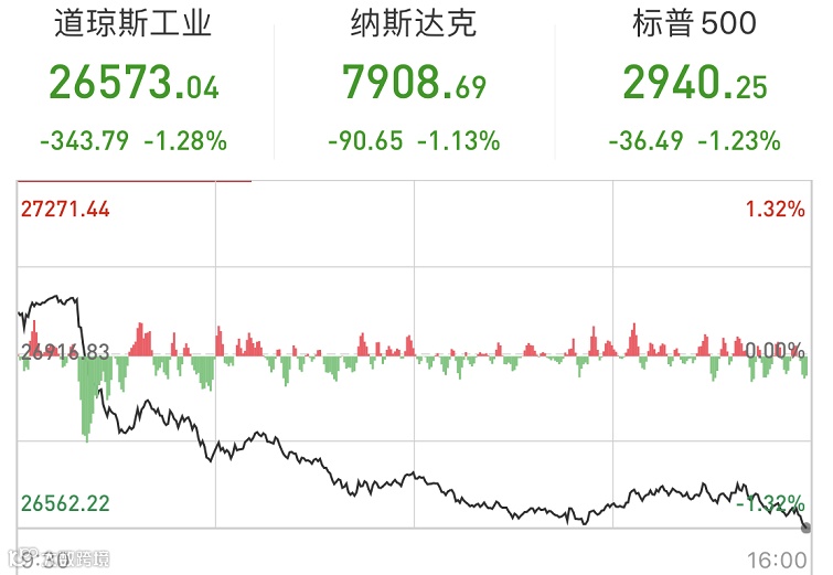美股三大股指在十月第一个交易日全线收跌1%。具体来看,在数据公布之后,美股三大股指抹去早盘涨幅直线跳水,截至收盘,道指下跌343.79点,跌幅1.28%,报26573.04点;标普500指数下跌36.49点或1.23%,报2940.25点;纳指报7908.69点,下跌90.65点,跌幅1.13%。
