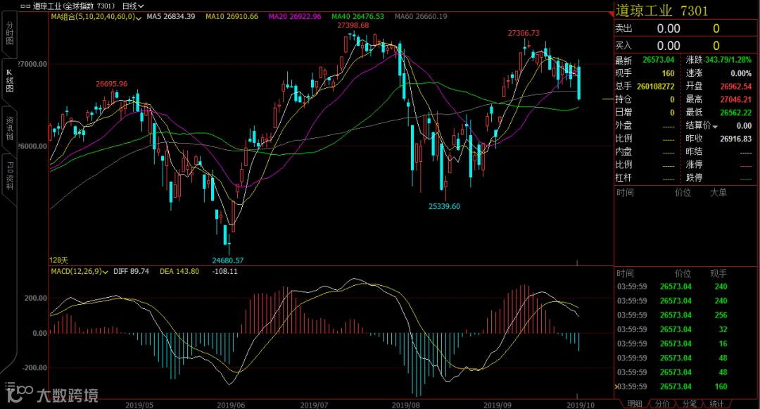 9月PMI数据不及预期,引发市场对于美国经济衰退风险的担忧,美股三大指数全线收跌。道指下跌343.79点或1.28%,收报26573.04点;纳指和标普500指数跌幅也都超过1%。前一日的反弹就此宣告夭折。