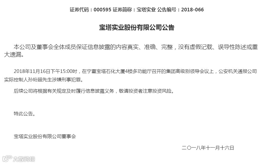 其实,宝塔实业已是千疮百孔。除了上述大股东股份被轮候冻结之外,银行账户也被多次冻结。最为重要的是,实控人孙珩超涉嫌刑事犯罪已经被抓。