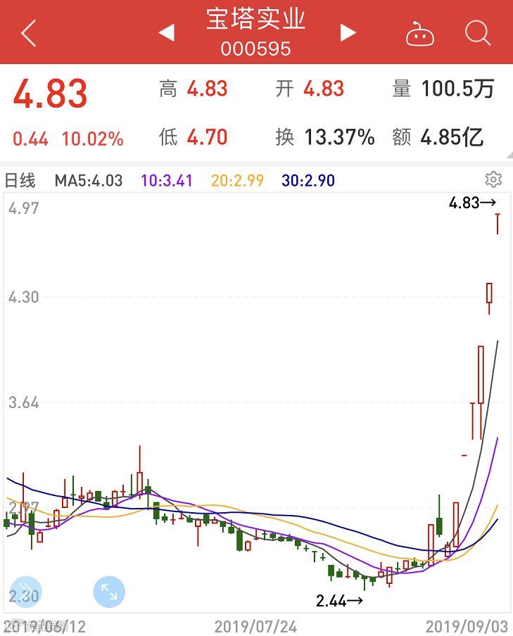 9月3日,宝塔实业再度涨停,收于4.83元。至此,宝塔实业已经连续收出6个涨停板。而在此之前的8月12日,该股最低价曾低至2.44元。也就是说,在经过17个交易日的上涨之后,宝塔实业股价已接近翻倍。