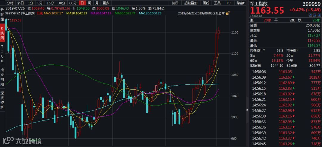 近期最热的板块是军工,军工指数从8月12日至今一直处于上升通道当中,涨幅已接近19%。