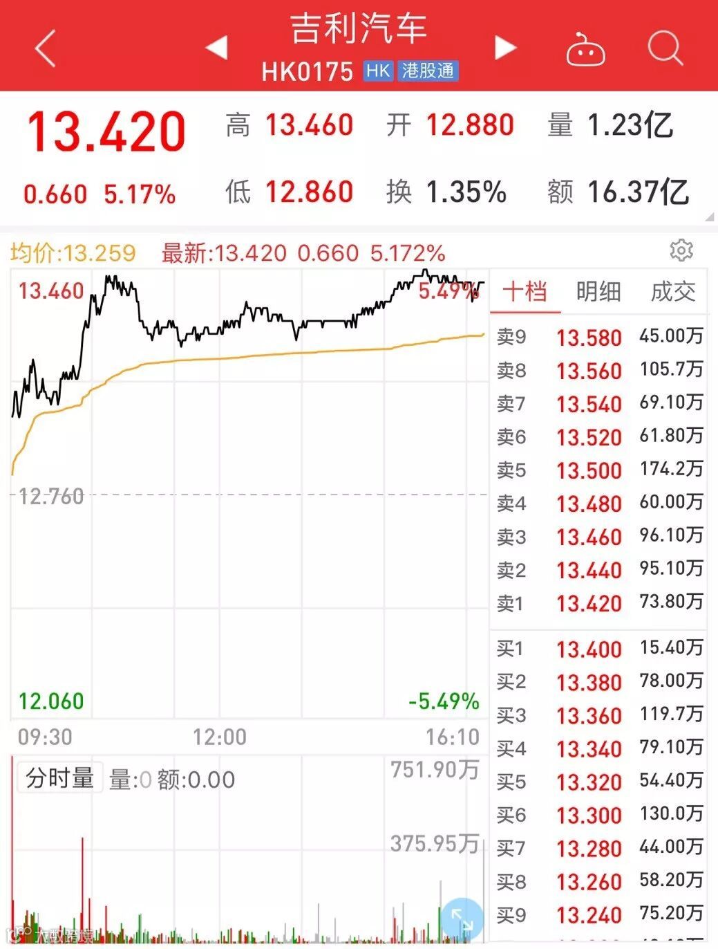 受此消息刺激,吉利汽车今日大幅上涨,收盘市值增长近60亿港元,涨幅达5.17%,收报13.42港元。