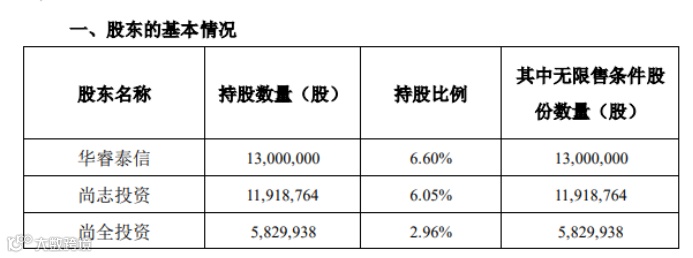 资料显示,华睿泰信持公司股份13,000,000股,占公司总股本的6.60%;尚志投资持公司股份11,918,764股,占公司总股本的6.05%;尚全投资持公司股份5,829,938股,占公司总股本的2.96%。