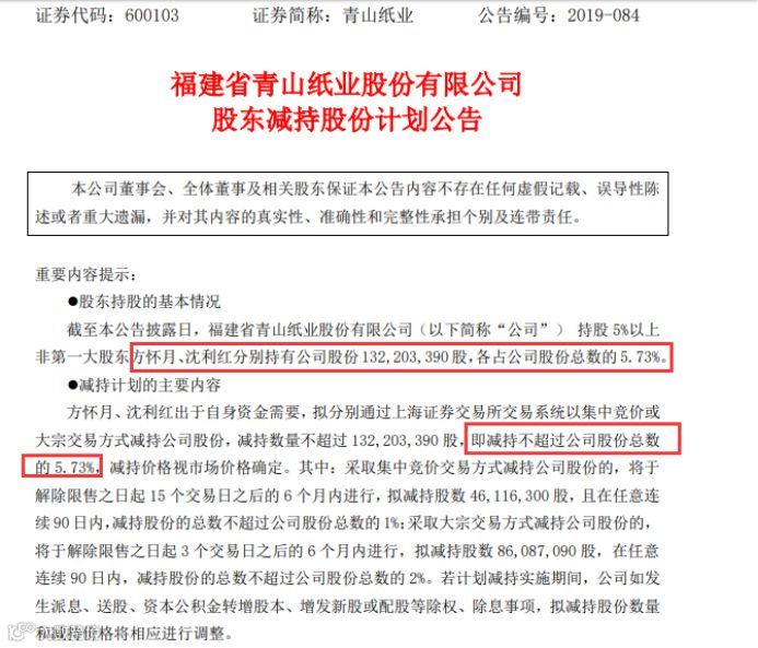 与上述两家公司相比,青山纸业(600103.SH)股东的减持计划计划更为庞大。