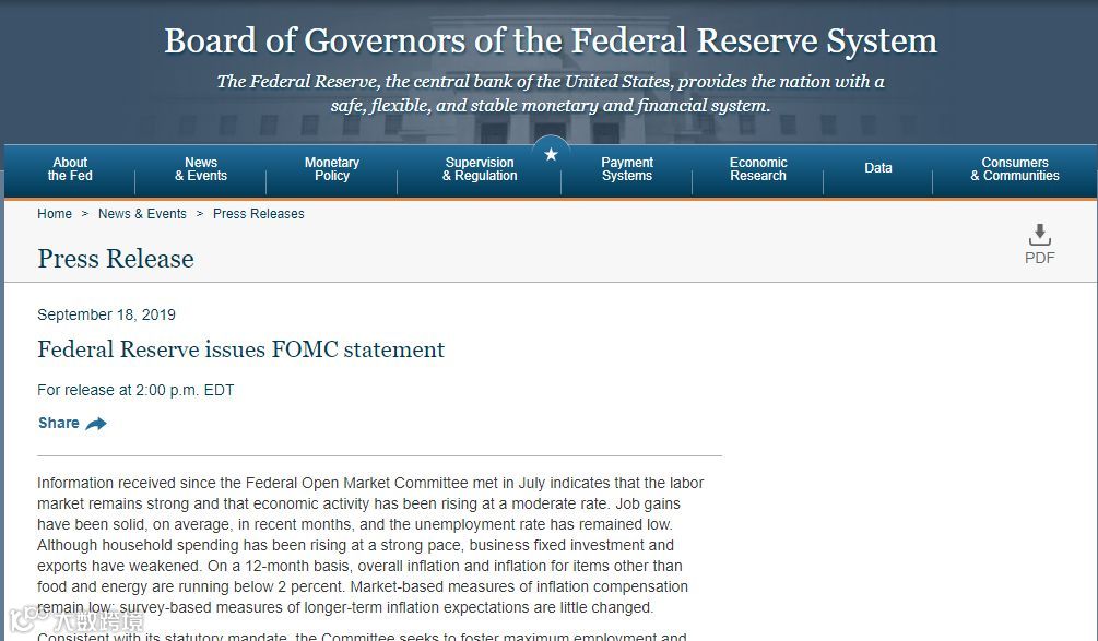 美联储于北京时间周四(9月19日)凌晨2点宣布降息25个基点并发布政策声明,以下是声明全文: