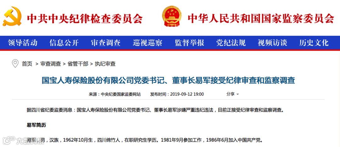 中秋节前夕,中央纪委国家监委网站挂出了省管干部被查的消息——国宝人寿党委书记、董事长易军,接受纪律审查和监察调查。