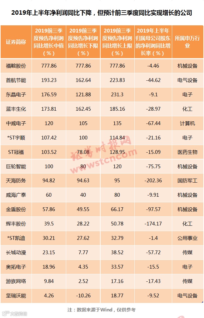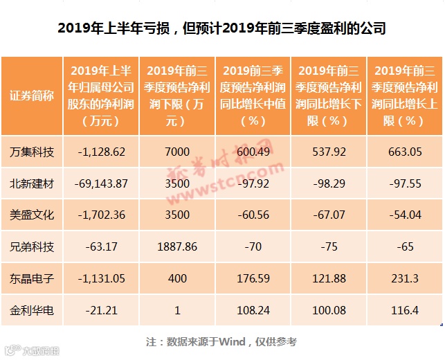 一些公司2019年上半年亏损,但预计前三季度净利润为正值,这意味预计第三季度单季经营情况好转,此类公司目前也有数家。
