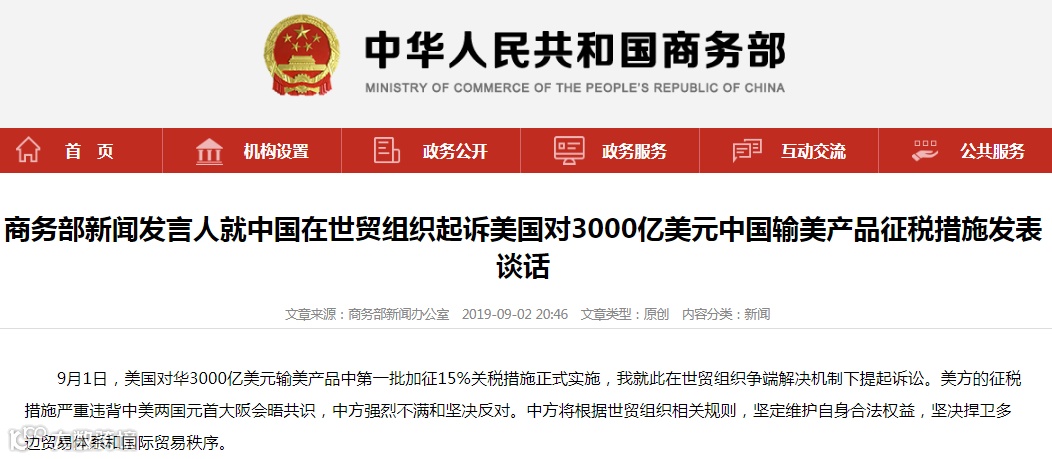 9月1日,美国对华3000亿美元输美产品中第一批加征15%关税措施正式实施,商务部新闻发言人发表谈话,指出中方就此在世贸组织争端解决机制下提起诉讼。美方的征税措施严重违背中美两国元首大阪会晤共识,中方强烈不满和坚决反对。中方将根据世贸组织相关规则,坚定维护自身合法权益,坚决捍卫多边贸易体系和国际贸易秩序。