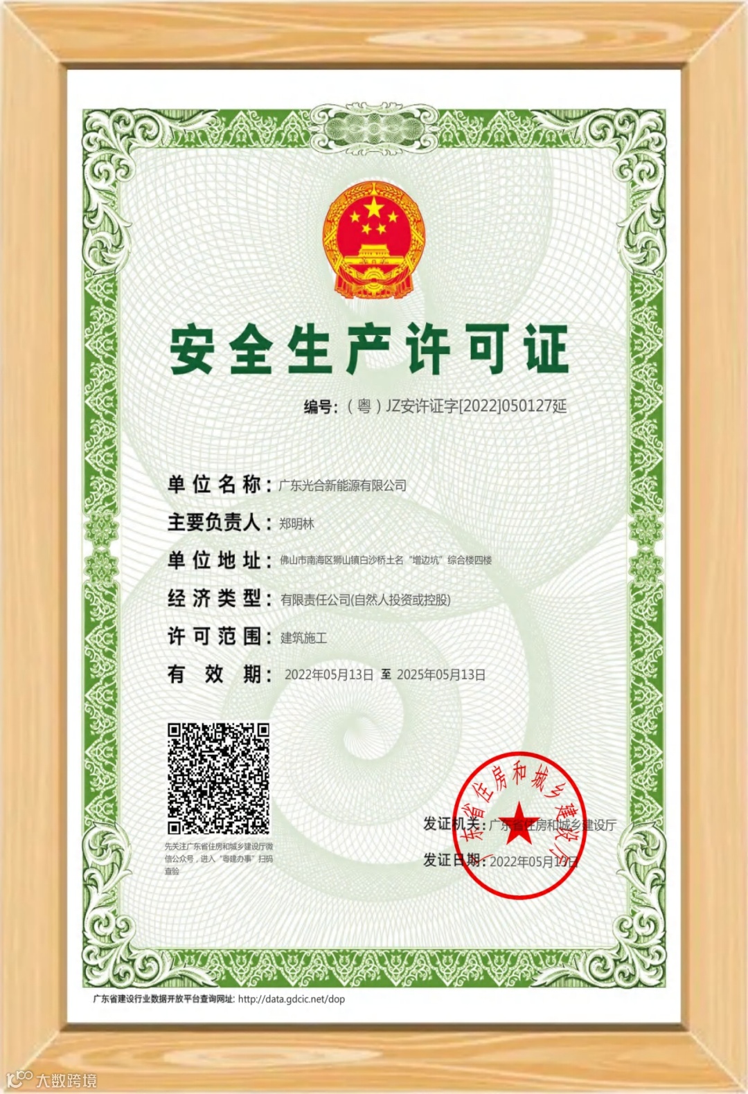 获得该证书说明光合能源严格遵循建筑工程安全生产监督管理,严格规范建筑施工企业安全生产条件,做好安全生产许可证的颁发和管理工作。