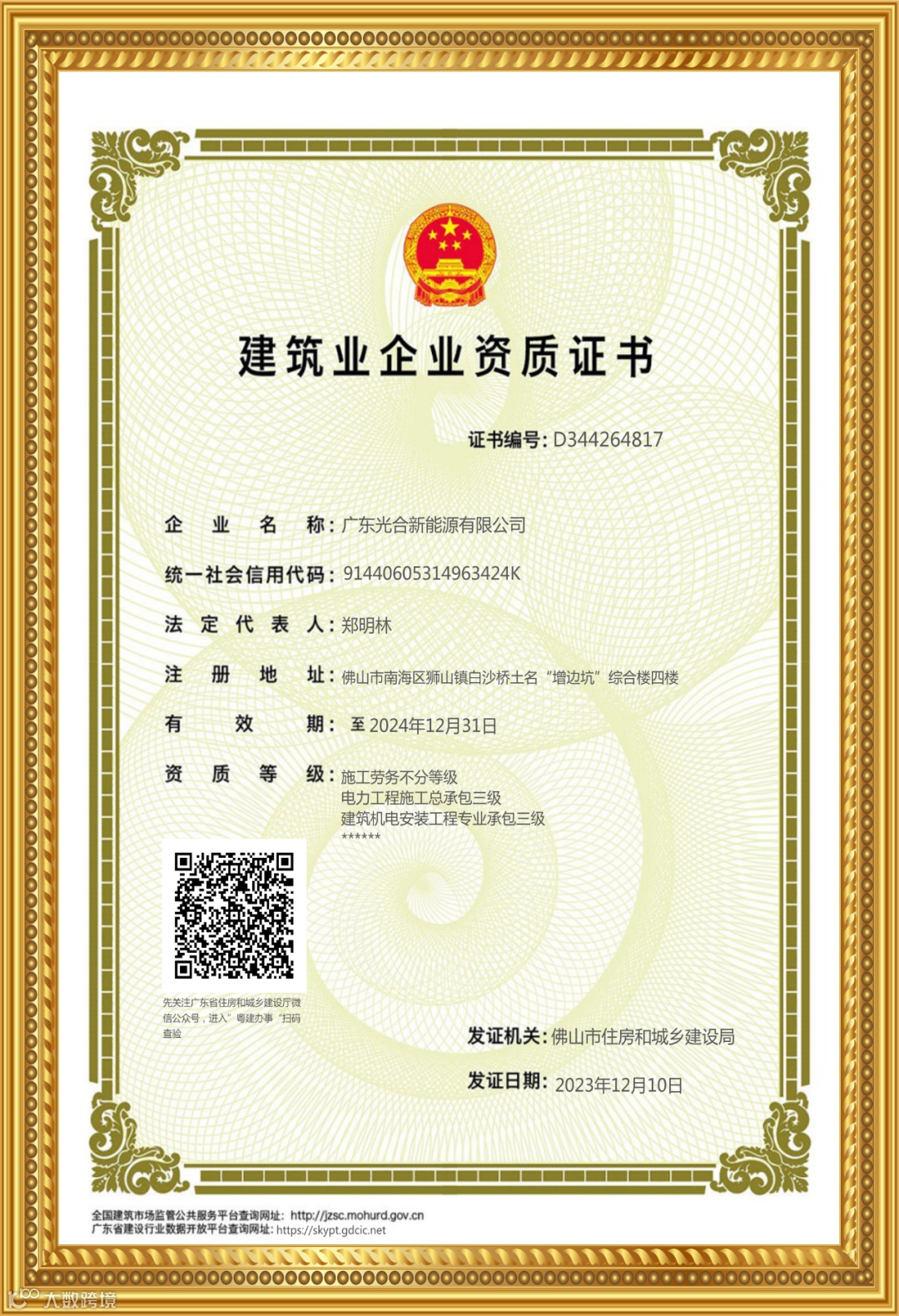 光合能源通过广东省高新技术企业和专精特新企业认证,具有电力工程施工总承包、建筑机电安装工程专业承包、承装(修、试)电力设施许可证、安全生产许可证、ISO三体系认证等资质证书,以及20多项国家级专利证书和30多个专利技术或发明专利。