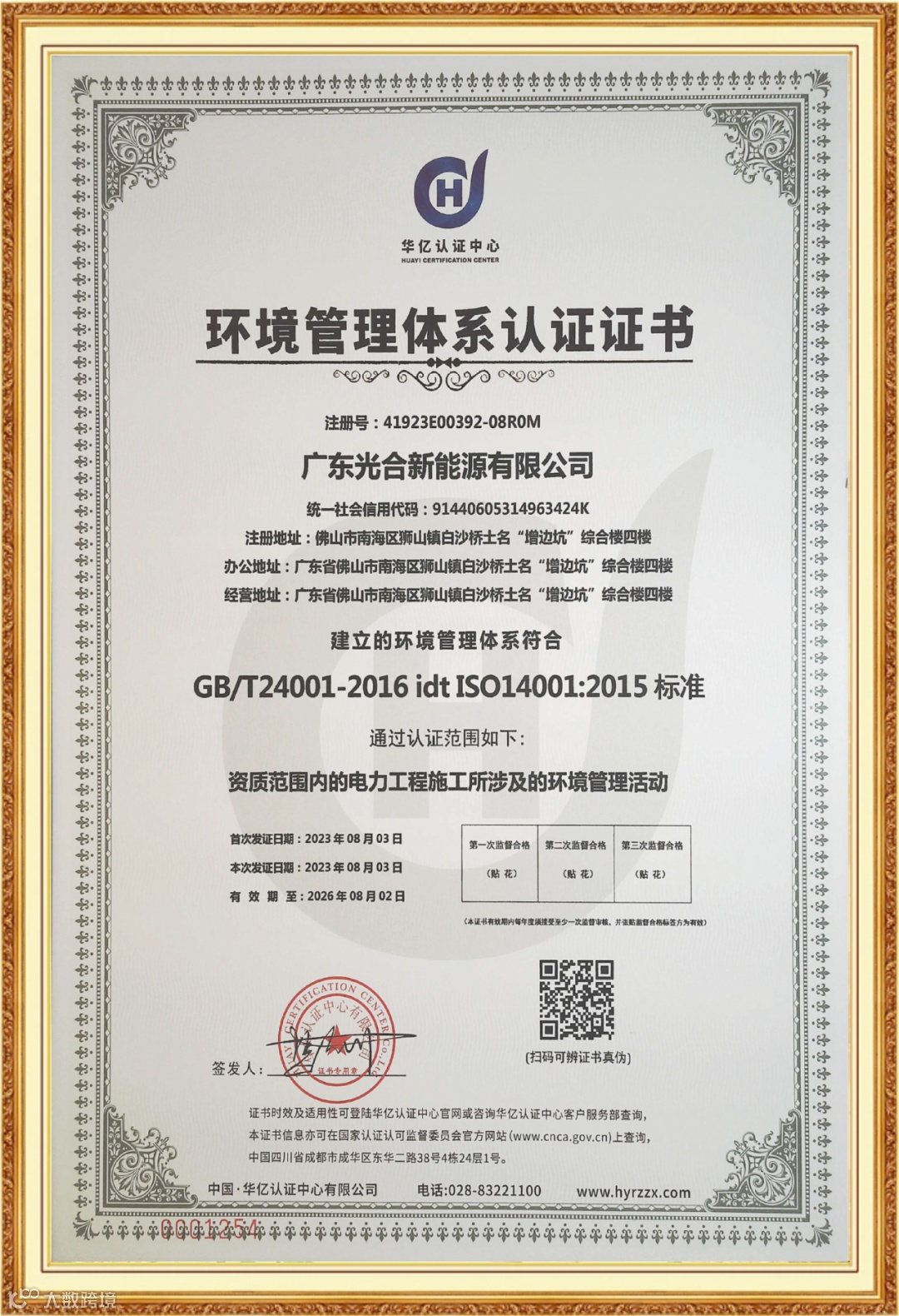环境管理体系认证是指由第三方公证机构依据公开发布的环境管理体系标准(ISO14000环境管理系列标准),对供方(生产方)的环境管理体系实施评定,评定合格的由第三方机构颁发环境管理体系认证证书,并给予注册公布,证明光合能源具有按既定环境保护标准和法规要求提供产品或服务的环境保证能力。