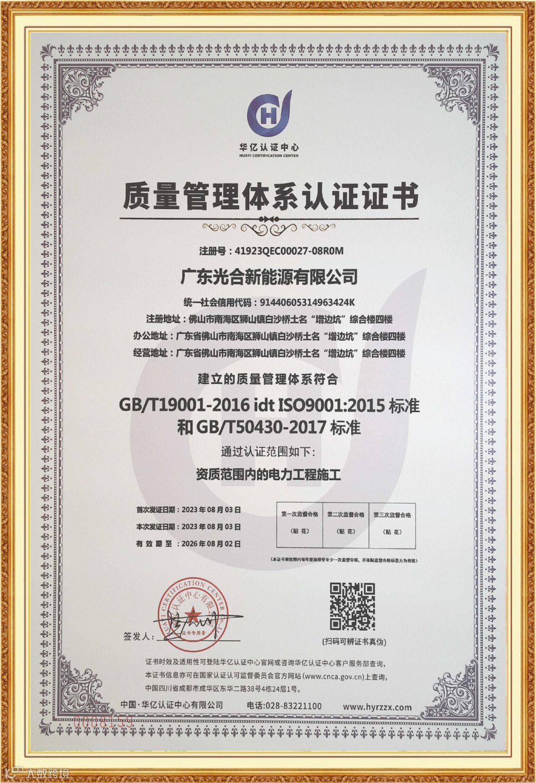 质量管理体系认证是指由取得质量管理体系认证资格的第三方认证机构,依据正式发布的质量管理体系标准,对企业的质量管理体系实施评定,评定合格的由第三方机构颁发质量管理体系认证证书,并给予注册公布,以证明光合能源质量管理和质量保证能力符合相应标准或有能力按规定的质量要求提供产品的活动。