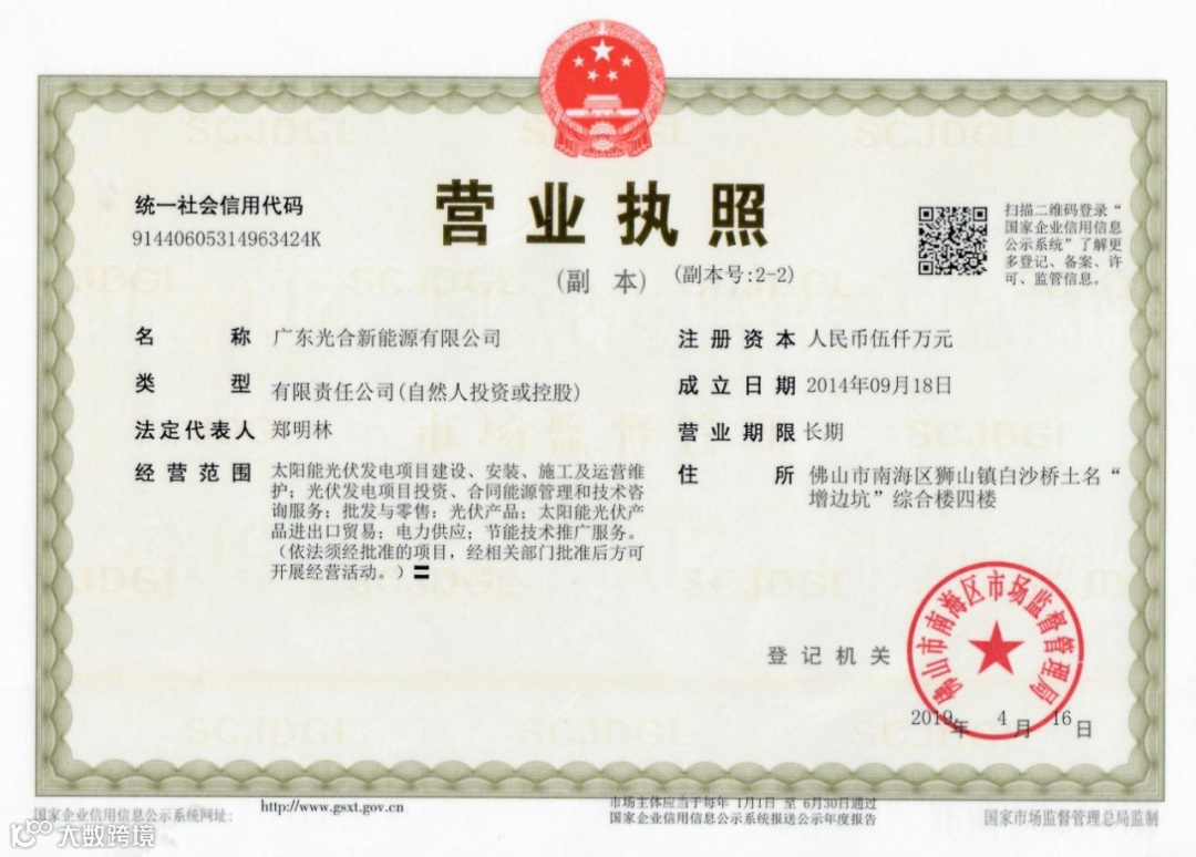 营业执照是工商行政管理机关发给工商企业、个体经营者的准许从事某项生产经营活动的凭证。其格式由国家市场监督管理总局统一规定。光合能源是广东省最早一批从事分布式光伏发电的企业,是光伏行业的领头羊。