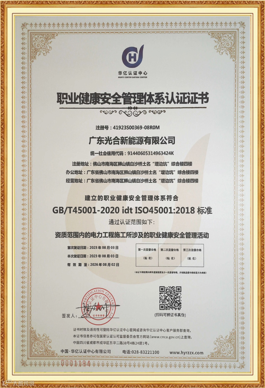 职业健康安全认证简称"OHSAS18000"。职业健康安全认证是由英国标准协会、挪威船级社等13个组织于1999年联合推出的国际性标准,它起到了准国际标准的作用,也是企业进行内审和认证机构实施认证审核的主要依据。光合能源完全具备资质。