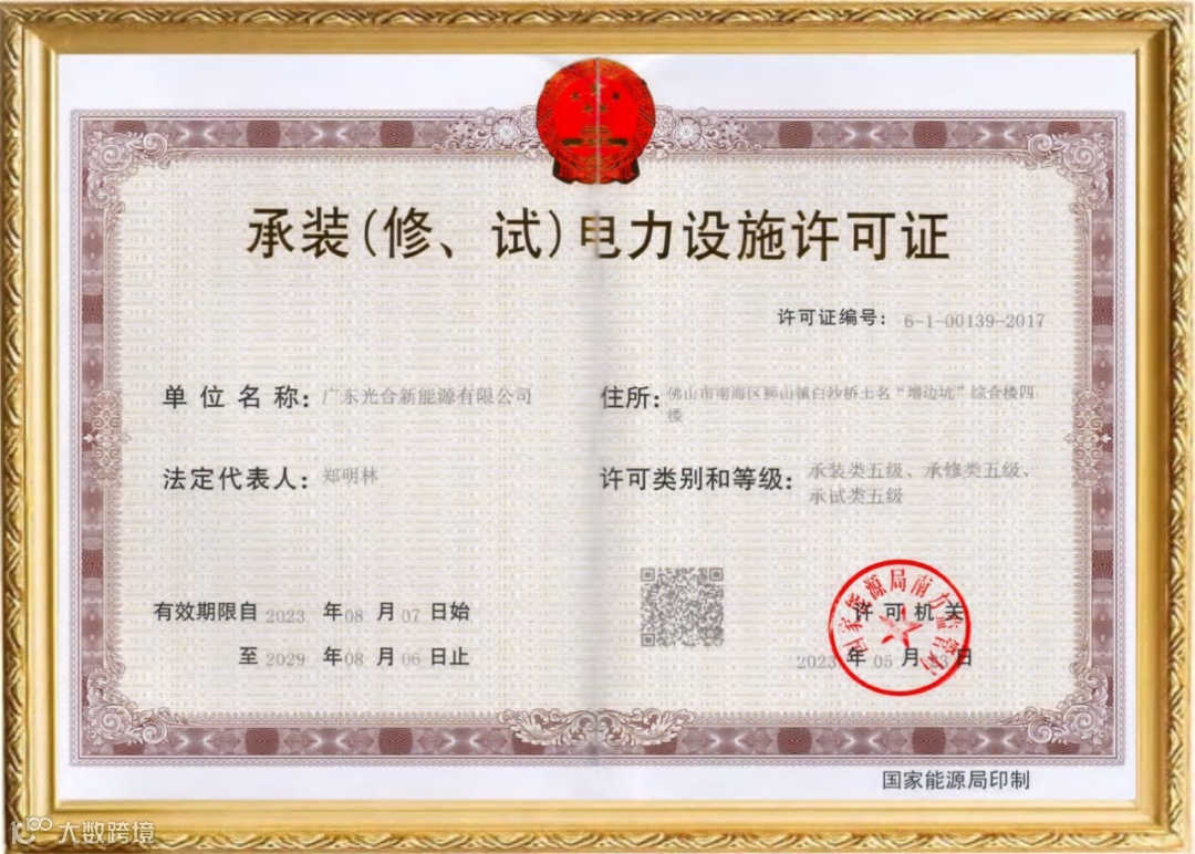 该资质指对输电、供电、受电电力设施的安装、维修和试验,可以从事 10千伏以下电压等级电力设施的安装、维修或者试验业务。目前,在佛山仅有若干家新能源公司取得此资质,其中一家就是光合能源。