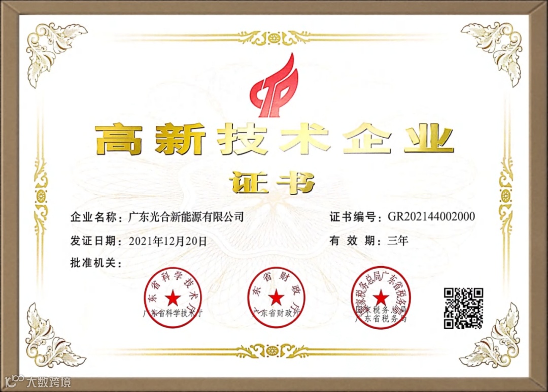 高新技术企业是在国家重点支持的高新技术领域内,持续进行研究开发与技术成果转化,形成企业核心自主知识产权,并以此为基础开展生产经营活动,在中国境内(不包括港、澳、台地区)注册一年以上的居民企业。光合能源已经多年获得此证书。