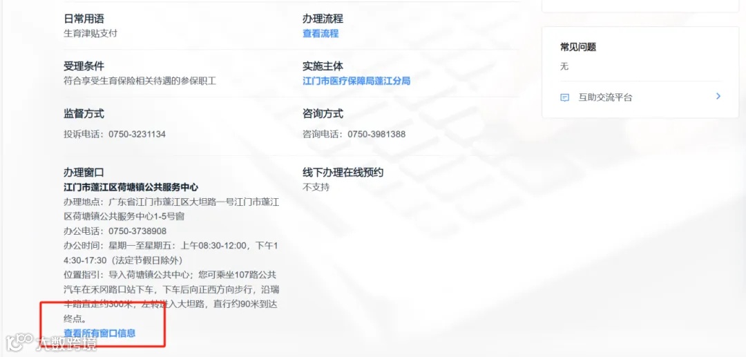 电脑登录广东政务服务网https://www.gdzwfw.gov.cn/,搜索【生育津贴支付】-地区选择【江门市】-对应事项点击【办理指南】-【选择办事区划】,即可查看线下办理窗口的全部名单。