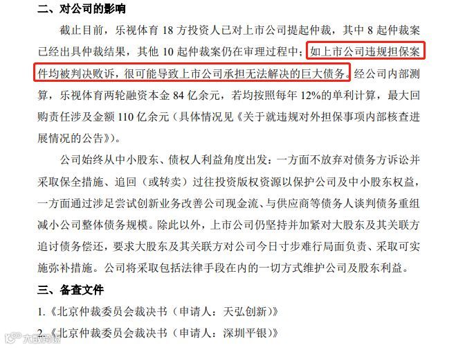 此前,乐视网陆续发布多份仲裁进展公告。乐视网表示,如上市公司违规担保案件均被判决败诉,很可能导致上市公司承担无法解决的巨大债务。上市公司仍坚持并加紧对大股东及其关联方追讨债务偿还,要求大股东及其关联方对公司今日寸步难行局面负责、采取可实施弥补措施。