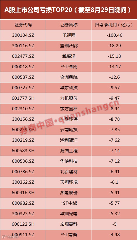 就已披露半年报的上市公司来看,目前共有382家处于亏损状态,89家亏损过亿,坚瑞沃能、雏鹰退、*ST神城、金洲慈航4家亏损超过10亿,但均未达到20亿水平。乐视网百亿亏损目前在A股市场上无人可出其右。