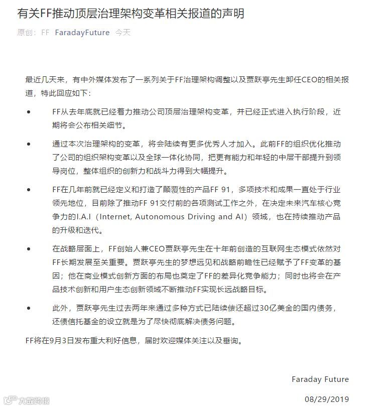 对此,法拉第未来迅速予以回应。8月29日早间,法拉第未来于官方公众号发布《有关FF推动顶层治理架构变革相关报道的声明》,虽对贾跃亭去向语焉不详,但在公告中仍极尽推崇这位颇有争议的CEO。