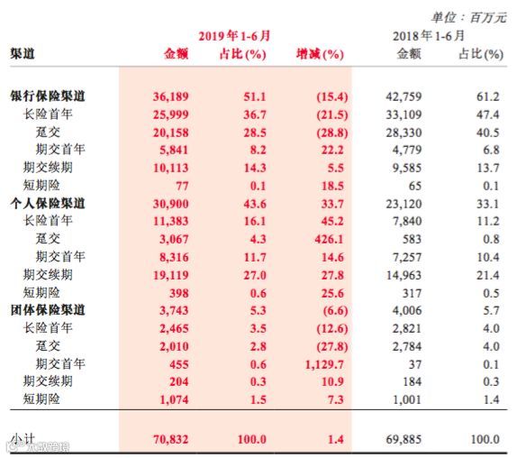 从渠道贡献来看,人保寿险银保渠道保费361.89亿,占比51.1%,同比下降10个百分点;个险保费309亿,占比提升10个百分点,升至43.6%。