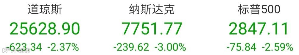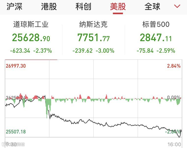 不过,翻红仅是昙花一现,截至收盘,道指大跌逾600点,跌幅2.37%,纳指大跌3%,标普500下跌2.59%。整体来看,美股总体市值一夜跌去9897亿美元,折合人民币约7万亿。