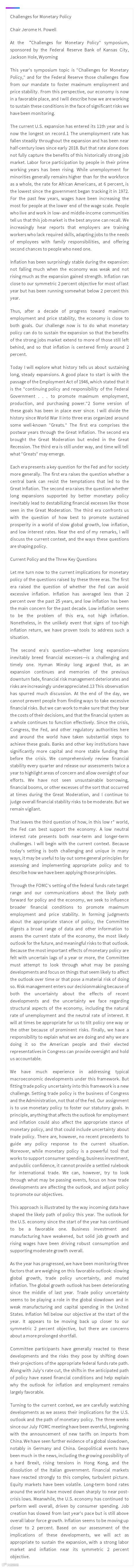 北京时间8月23日晚上10点,美联储主席鲍威尔在杰克逊霍尔央行年会发表了题为《货币政策的挑战》“Challenges for Monetary Policy”的演讲。演讲全文比较长,在谈到当下的货币政策时,鲍威尔表示,世界已经进入多事之秋,主要经济体的经济放缓得到进一步的验证,他将采取适当行动,以维持美国经济扩张。经济处于有利状况,但也面临“显著风险”。