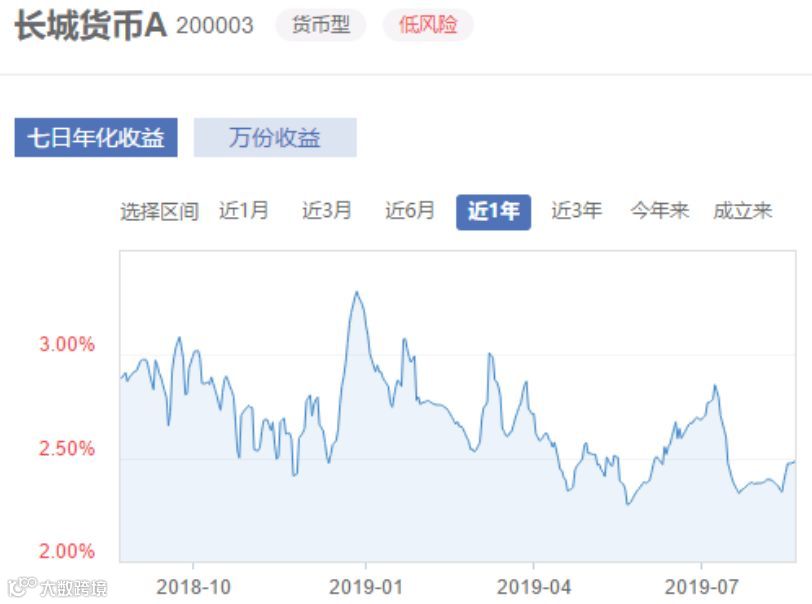 再以余额宝的一款基金——长城货币A为例。上图为其近一年的收益率走势,可以看到,其七日年化收益不断的震荡走低。目前已经接近最低点。曾经破7的年化收益率一去不复返。