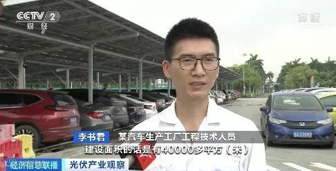 某汽车生产工厂工程技术人员李书君:一部分区域目前已经完成了10000平方米的光伏电站建设,另一部分区域也是计划在今年完成光伏电站建设,建设面积有40000多平方米。