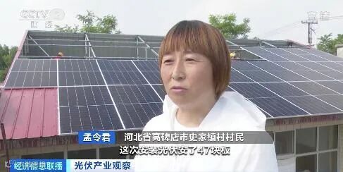 河北省高碑店市史家镇村村民孟令君:这次安装光伏电站共安了47块板,容量24千瓦,平时自家用不了的电,发了电还可以卖给我们这里的供电所又多了一笔额外的收益。