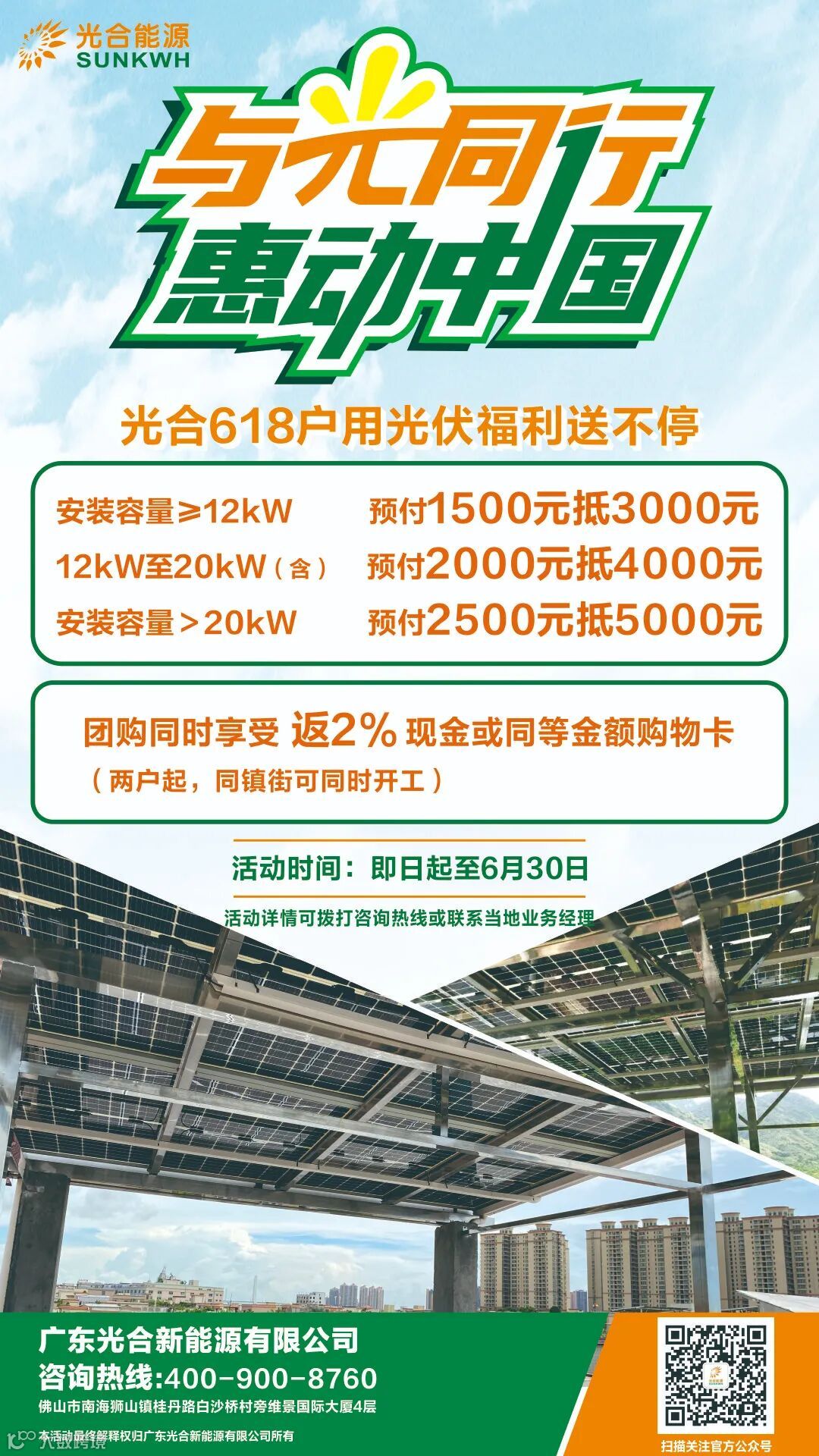 给大家介绍关于农村自建房安装光伏电站的多重利好后,为推动《“十四五”可再生能源发展规划》,加强农村屋顶光伏电站的快速建设与发展;光合能源在六月品牌活动月推出户用光伏电站安装福利,现在安装一定或以上的光伏电站容量,预付一定的订金可抵相应的货款,团购(两户起,同镇街可同时开工)同时享受返2%现金或同等金额购物卡,活动至本月30日结束,有意向安装户用光伏电站的朋友欢迎拨打下方海报联系电话咨询。