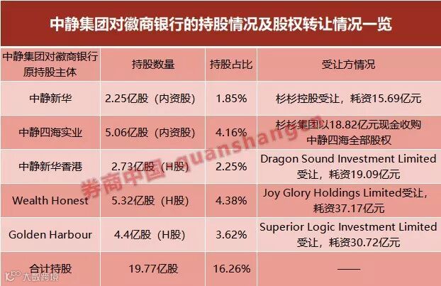 而除内资股外,中静新华还通过旗下三个100%控制的境外企业合计持有12.46亿股徽商银行H股。