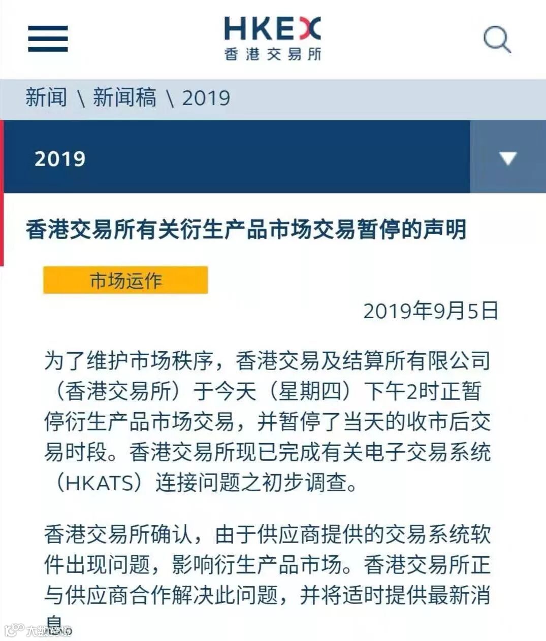 9月5日上午,港交所市场网站(HKEX.com.hk)及集团网站(HKEXGroup.com)受技术问题影响,无法打开,午间港交所宣布暂停衍生品市场交易。