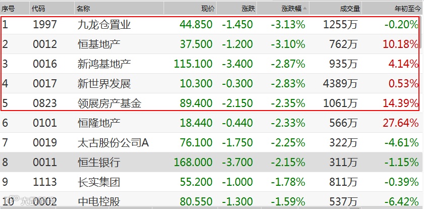 而4日暴涨的香港地产股5日拖累指数最大,全线下跌,截至收盘,跌幅前五的九龙仓置业跌3.13%,报44.85港元/股,恒基地产跌3.1%,报37.5港元/股,新鸿基地产跌2.87%,报115.1港元,新世界发展跌2.83%,报10.3港元,领展房产基金跌2.15%,报89.4港元。